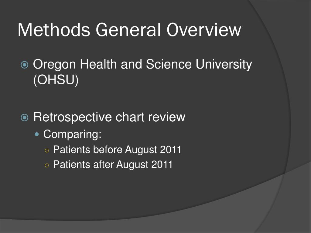 Methods General Overview • Oregon Health and Science University (OHSU) • Retrospective chart review • Comparing: • Patients before August 2011 • Patients after August 2011