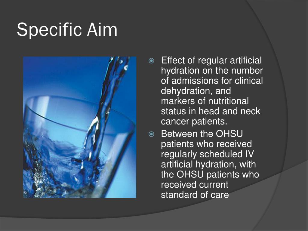 Regularly Scheduled Artificial (IV) Hydration among Head and Neck Cancer Patients Undergoing Radiotherapy-based Treatment. By Jessica Mooney With special thanks to: Melanie Gillingham Phd, RD, Dr. John Holland, Sonja Connors PhD, RD, and Shannon Rentz, RD. Specific Aim.