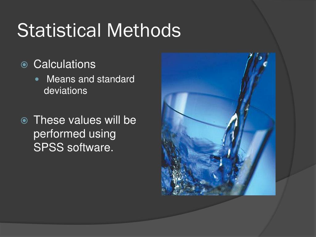 Statistical Methods • Calculations • Means and standard deviations • These values will be performed using SPSS software.