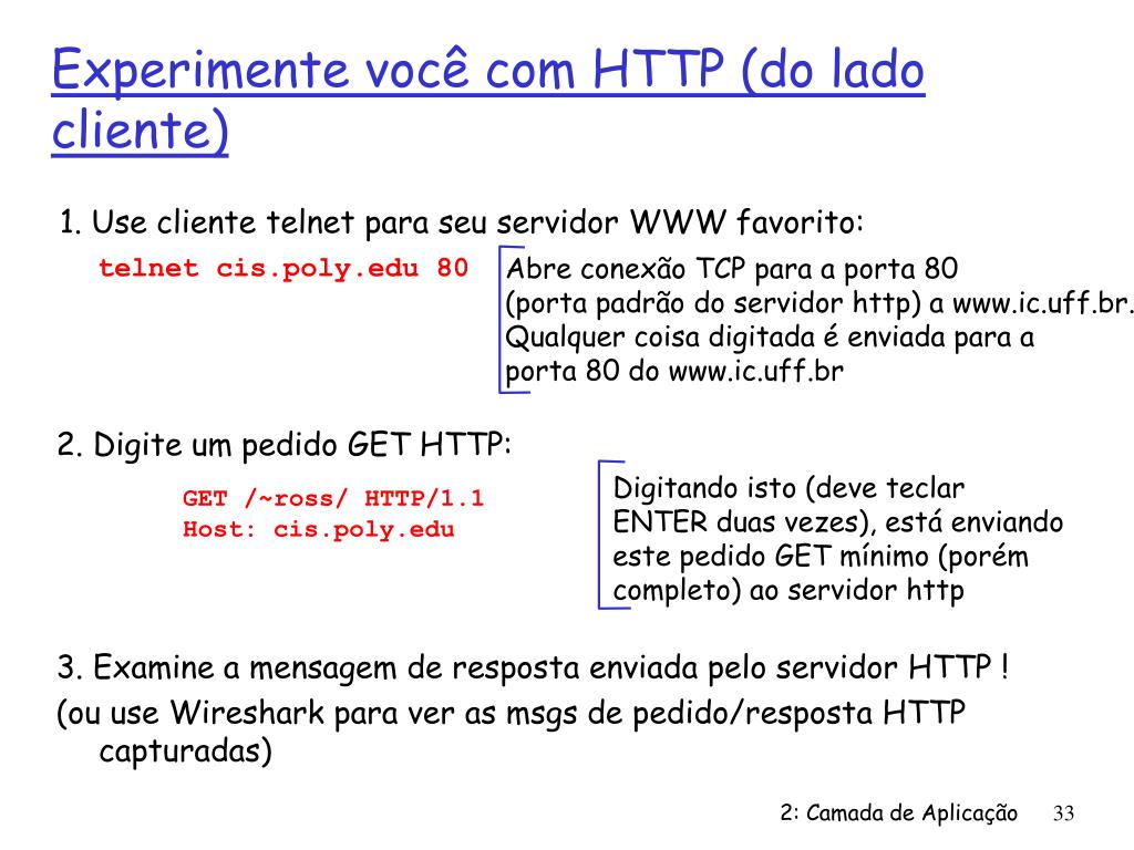 1. Use cliente telnet para seu servidor WWW favorito: Experimente você com HTTP (do lado cliente) telnetcis.poly.edu 80 Abre conexão TCP para a porta 80 (porta padrão do servidor http) a www.ic.uff.br. Qualquer coisa digitada é enviada para a porta 80 do www.ic.uff.br 2. Digite um pedido GET HTTP: Digitando isto (deve teclar ENTER duas vezes), está enviando este pedido GET mínimo (porém completo) ao servidor http GET /~ross/ HTTP/1.1 Host: cis.poly.edu 3. Examine a mensagem de resposta enviada pelo servidor HTTP ! (ou use Wireshark para ver as msgs de pedido/resposta HTTP capturadas) 2: Camada de Aplicação
