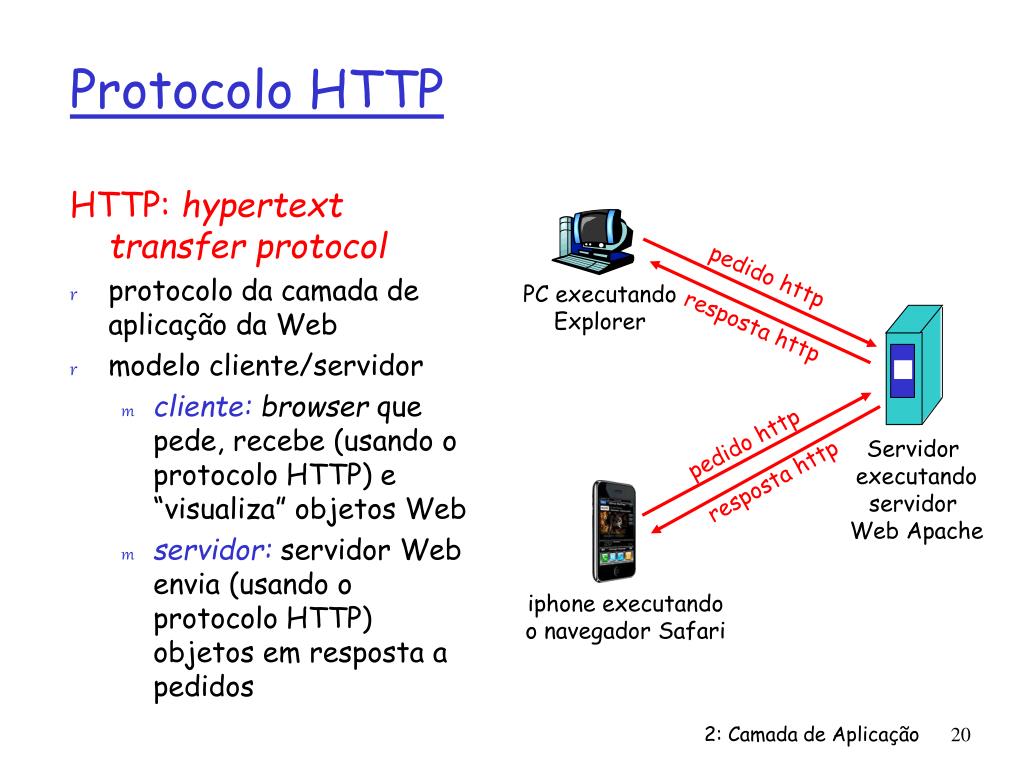 HTTP: hypertext transferprotocol protocolo da camada de aplicação da Web modelo cliente/servidor cliente:browser que pede, recebe (usando o protocolo HTTP) e “visualiza” objetos Web servidor: servidor Web envia (usando o protocolo HTTP) objetos em resposta a pedidos Protocolo HTTP pedido http PC executando Explorer resposta http pedido http Servidor executando servidor Web Apache resposta http iphoneexecutando o navegador Safari 2: Camada de Aplicação