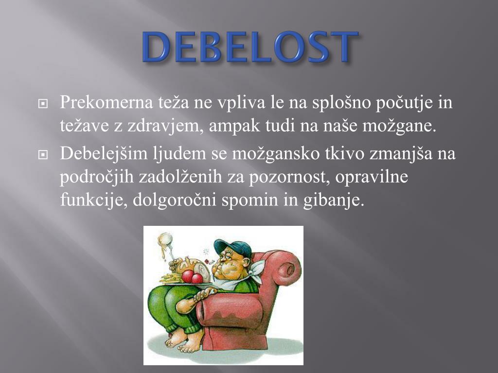 DEBELOST • Prekomerna teža ne vpliva le na splošno počutje in težave z zdravjem, ampak tudi na naše možgane. • Debelejšim ljudem se možgansko tkivo zmanjša na področjih zadolženih za pozornost, opravilne funkcije, dolgoročni spomin in gibanje.