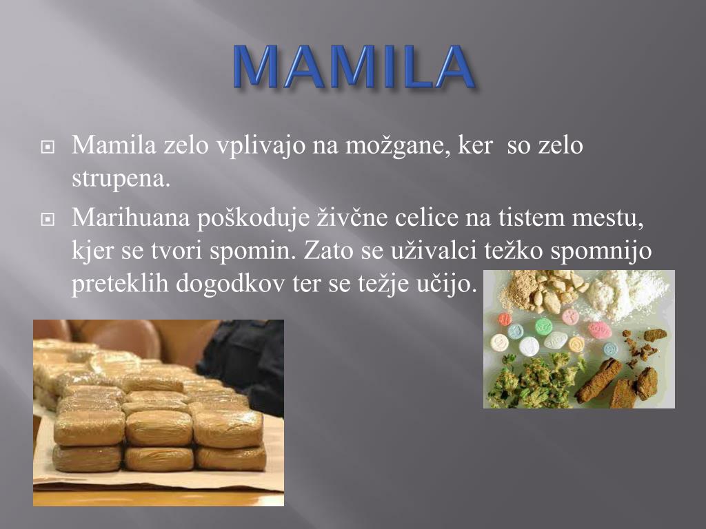 MAMILA • Mamila zelo vplivajo na možgane, ker so zelo strupena. • Marihuana poškoduje živčne celice na tistem mestu, kjer se tvori spomin. Zato se uživalci težko spomnijo preteklih dogodkov ter se težje učijo.