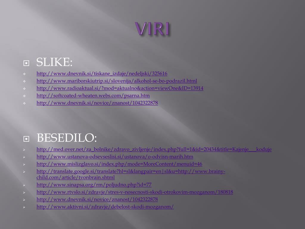 VIRI • SLIKE: • http://www.dnevnik.si/tiskane_izdaje/nedeljski/325616 • http://www.mariborskiutrip.si/slovenija/alkohol-se-bo-podrazil.html • http://www.radioaktual.si/?mod=aktualno&action=viewOne&ID=13914 • http://softcoated-wheaten.webs.com/psarna.htm • http://www.dnevnik.si/novice/znanost/1042322878 • BESEDILO: • http://med.over.net/za_bolnike/zdravo_zivljenje/index.php?full=1&id=20434&title=Kajenje___koduje • http://www.ustanova-odsevseslisi.si/ustanova/o-odvisn-marih.htm • http://www.mislizglavo.si/index.php/mode=MoreContent/menuid=46 • http://translate.google.si/translate?hl=sl&langpair=en|sl&u=http://www.brainy-child.com/article/tvonbrain.shtml • http://www.sinapsa.org/rm/poljudno.php?id=77 • http://www.rtvslo.si/zdravje/stres-v-nosecnosti-skodi-otrokovim-mozganom/180818 • http://www.dnevnik.si/novice/znanost/1042322878 • http://www.aktivni.si/zdravje/debelost-skodi-mozganom/