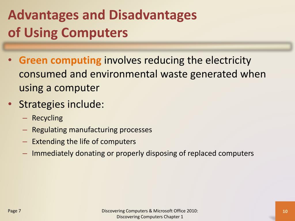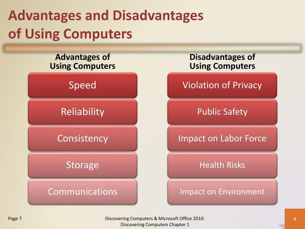 Advantages and Disadvantages of Using Computers Advantages of Using Computers Disadvantages of Using Computers Page 7 Discovering Computers & Microsoft Office 2010: Discovering Computers Chapter 1