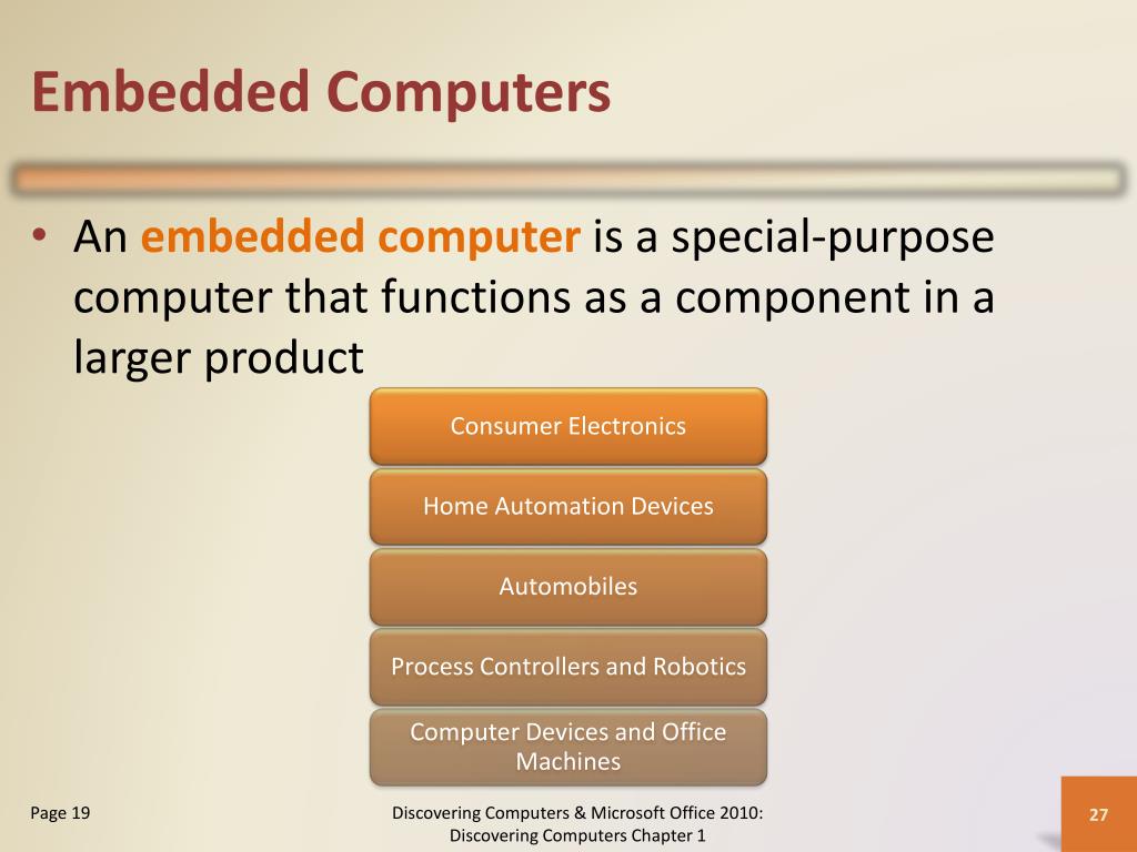 Embedded Computers • An embedded computeris a special-purpose computer that functions as a component in a larger product Page 19 Discovering Computers & Microsoft Office 2010: Discovering Computers Chapter 1