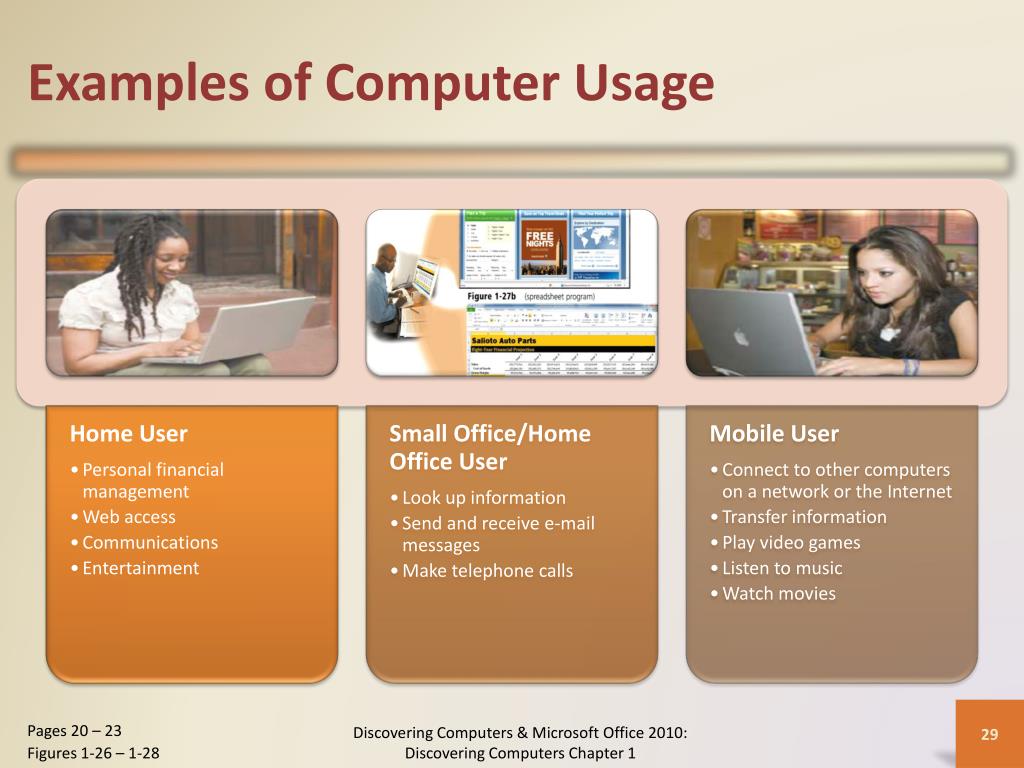 Examples of Computer Usage Pages 20 – 23 Figures 1-26 – 1-28 Discovering Computers & Microsoft Office 2010: Discovering Computers Chapter 1
