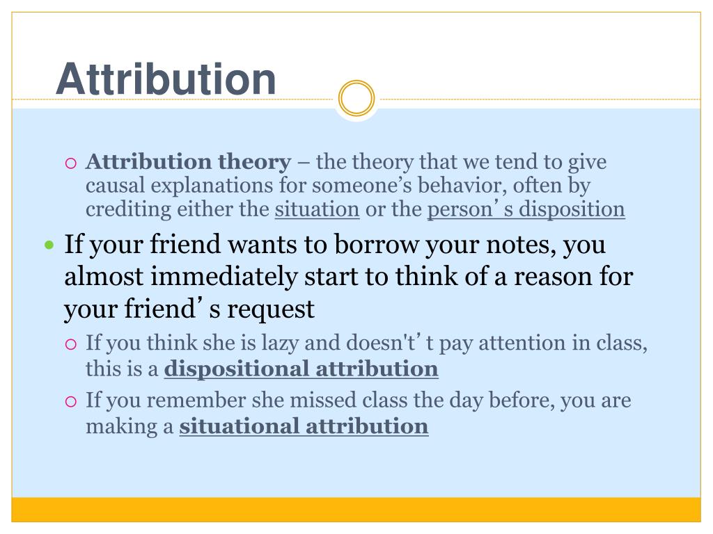 Attribution • Attribution theory – the theory that we tend to give causal explanations for someone’s behavior, often by crediting either the situation or the person’s disposition • If your friend wants to borrow your notes, you almost immediately start to think of a reason for your friend’s request • If you think she is lazy and doesn't’t pay attention in class, this is a dispositional attribution • If you remember she missed class the day before, you are making a situational attribution