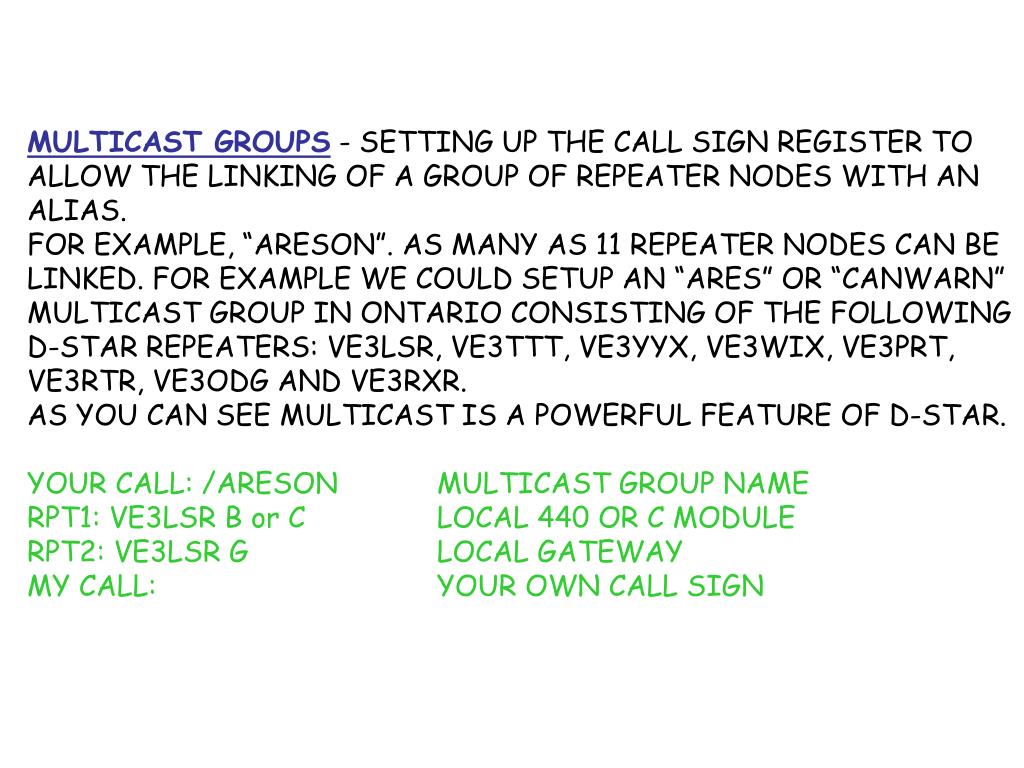 MULTICAST GROUPS - SETTING UP THE CALL SIGN REGISTER TO ALLOW THE LINKING OF A GROUP OF REPEATER NODES WITH AN ALIAS. FOR EXAMPLE, “ARESON”. AS MANY AS 11 REPEATER NODES CAN BE LINKED. FOR EXAMPLE WE COULD SETUP AN “ARES” OR “CANWARN” MULTICAST GROUP IN ONTARIO CONSISTING OF THE FOLLOWING D-STAR REPEATERS: VE3LSR, VE3TTT, VE3YYX, VE3WIX, VE3PRT, VE3RTR, VE3ODG AND VE3RXR. AS YOU CAN SEE MULTICAST IS A POWERFUL FEATURE OF D-STAR. YOUR CALL: /ARESON MULTICAST GROUP NAME RPT1: VE3LSR B or C LOCAL 440 OR C MODULE RPT2: VE3LSR G LOCAL GATEWAY MY CALL: YOUR OWN CALL SIGN