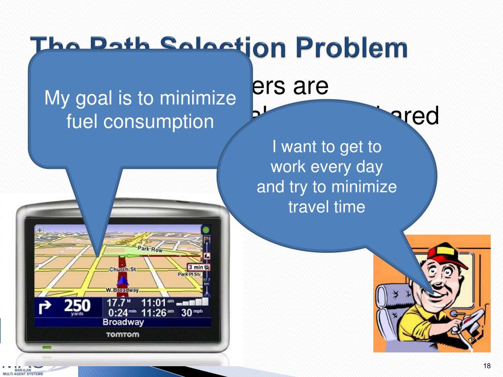The Path Selection Problem My goal is to minimize fuel consumption People and computers are self-interested, but also have shared goals I want to get to work every day and try to minimize travel time