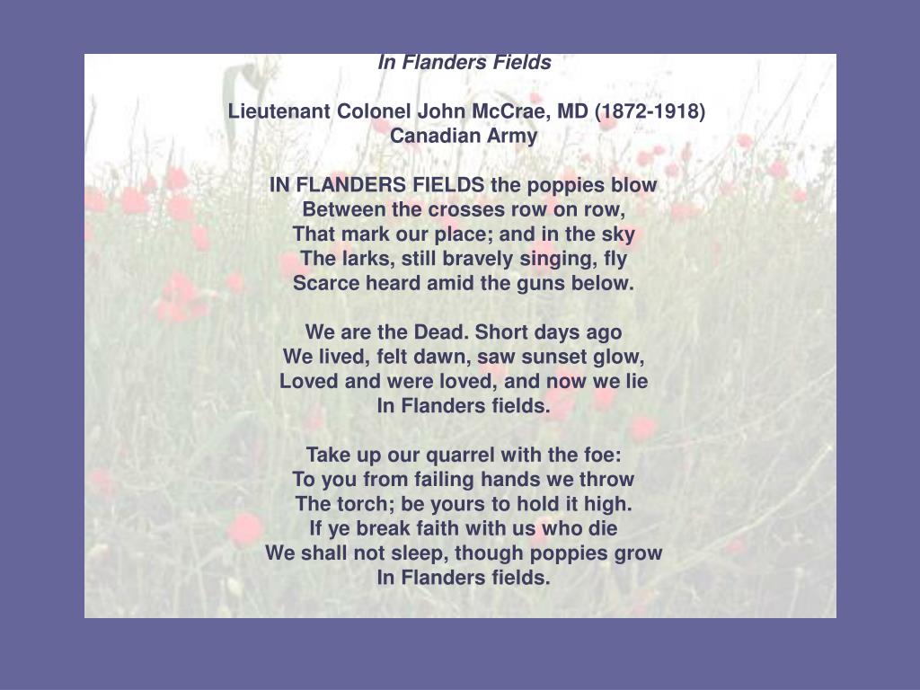 In Flanders Fields Lieutenant Colonel John McCrae, MD (1872-1918)Canadian Army IN FLANDERS FIELDS the poppies blowBetween the crosses row on row,That mark our place; and in the skyThe larks, still bravely singing, flyScarce heard amid the guns below. We are the Dead. Short days agoWe lived, felt dawn, saw sunset glow,Loved and were loved, and now we lieIn Flanders fields. Take up our quarrel with the foe:To you from failing hands we throwThe torch; be yours to hold it high.If ye break faith with us who dieWe shall not sleep, though poppies growIn Flanders fields. In Flanders Fields Lieutenant Colonel John McCrae, MD (1872-1918)Canadian Army IN FLANDERS FIELDS the poppies blowBetween the crosses row on row,That mark our place; and in the skyThe larks, still bravely singing, flyScarce heard amid the guns below. We are the Dead. Short days agoWe lived, felt dawn, saw sunset glow,Loved and were loved, and now we lieIn Flanders fields. Take up our quarrel with the foe:To you from failing hands we throwThe torch; be yours to hold it high.If ye break faith with us who dieWe shall not sleep, though poppies growIn Flanders fields.