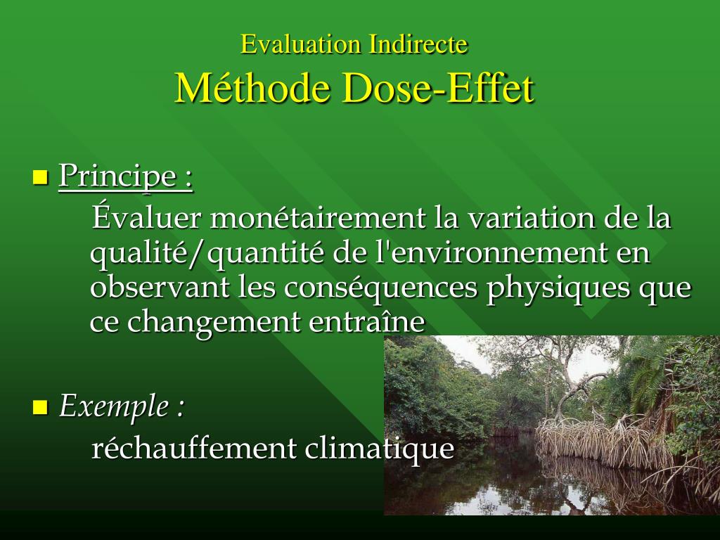 Evaluation IndirecteMéthode Dose-Effet • Principe : Évaluer monétairement la variation de la qualité/quantité de l'environnement en observant les conséquences physiques que ce changement entraîne • Exemple : réchauffement climatique