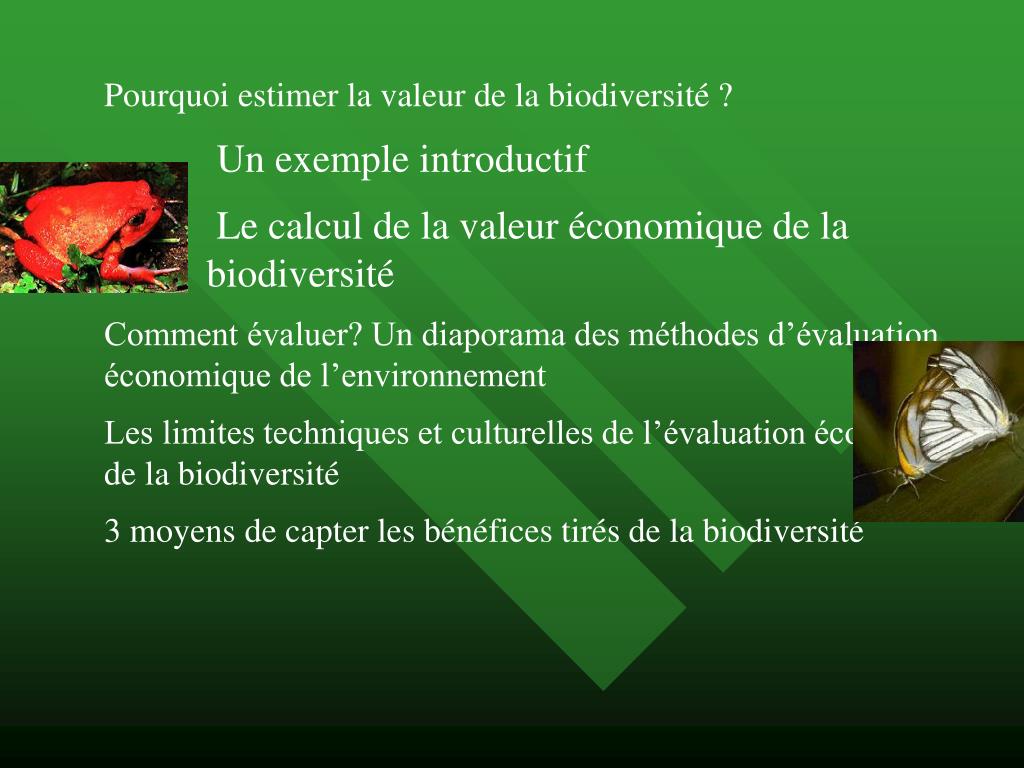 Pourquoi estimer la valeur de la biodiversité ? Un exemple introductif Le calcul de la valeur économique de la biodiversité • Comment évaluer? Un diaporama des méthodes d’évaluation économique de l’environnement • Les limites techniques et culturelles de l’évaluation économique de la biodiversité • 3 moyens de capter les bénéfices tirés de la biodiversité