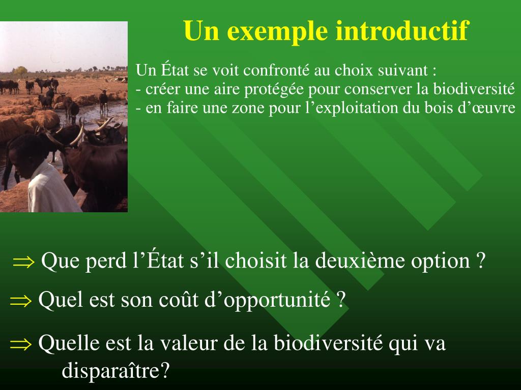 Un exemple introductif Un État se voit confronté au choix suivant : - créer une aire protégée pour conserver la biodiversité - en faire une zone pour l’exploitation du bois d’œuvre Que perd l’État s’il choisit la deuxième option ? Quel est son coût d’opportunité ? Quelle est la valeur de la biodiversité qui va disparaître?