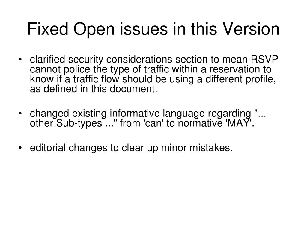Fixed Open issues in this Version • clarified security considerations section to mean RSVP cannot police the type of traffic within a reservation to know if a traffic flow should be using a different profile, as defined in this document. • changed existing informative language regarding "... other Sub-types ..." from 'can' to normative 'MAY'. • editorial changes to clear up minor mistakes.
