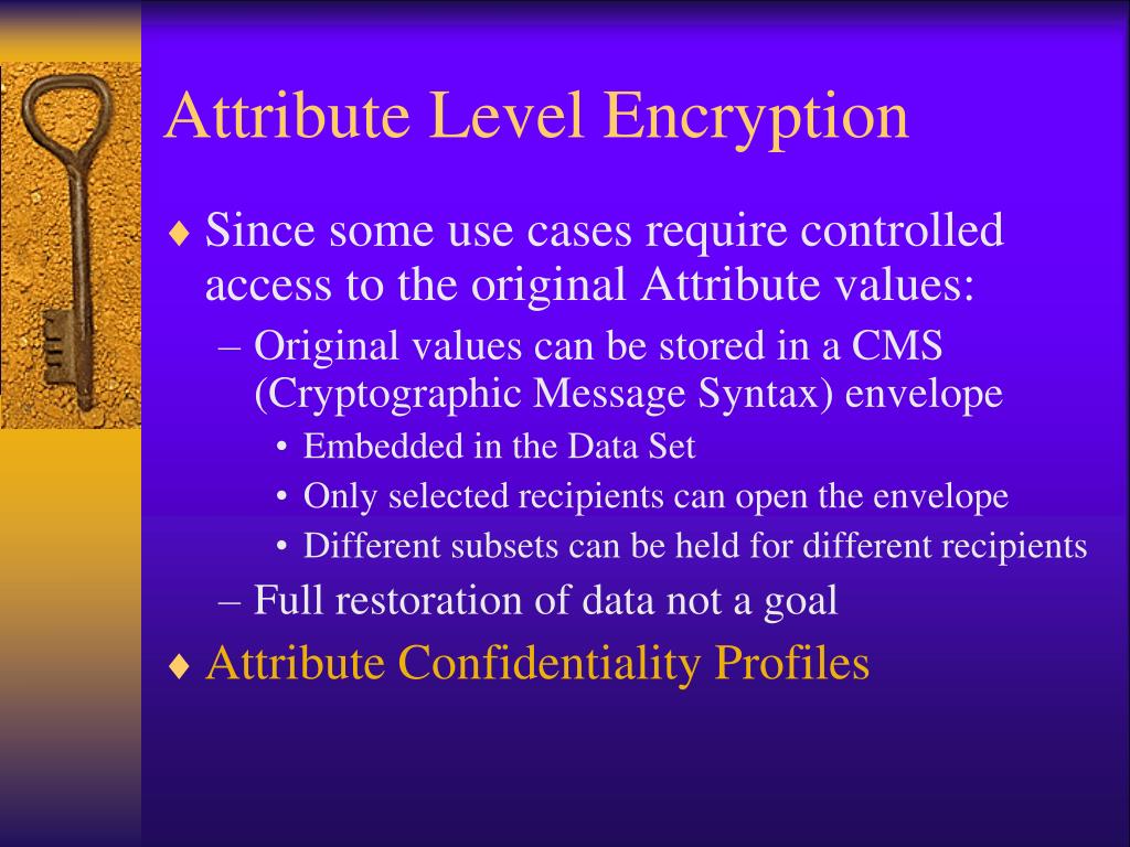 Attribute Level Encryption • Since some use cases require controlled access to the original Attribute values: • Original values can be stored in a CMS (Cryptographic Message Syntax) envelope • Embedded in the Data Set • Only selected recipients can open the envelope • Different subsets can be held for different recipients • Full restoration of data not a goal • Attribute Confidentiality Profiles