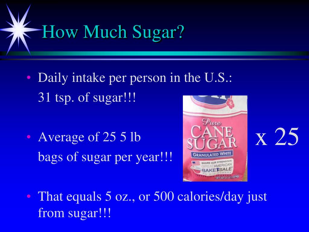 How Much Sugar? • Daily intake per person in the U.S.: 31 tsp. of sugar!!! • Average of 25 5 lb bags of sugar per year!!! • That equals 5 oz., or 500 calories/day just from sugar!!! x 25
