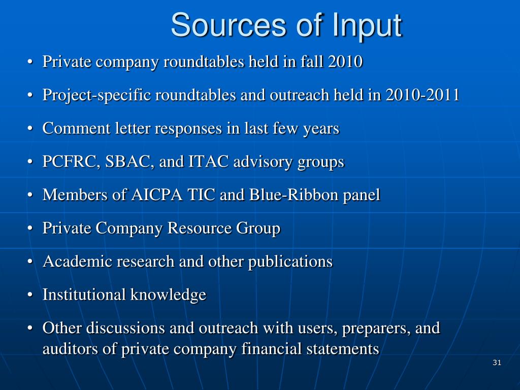 Sources of Input Private company roundtables held in fall 2010 Project-specific roundtables and outreach held in 2010-2011 Comment letter responses in last few years PCFRC, SBAC, and ITAC advisory groups Members of AICPA TIC and Blue-Ribbon panel Private Company Resource Group Academic research and other publications Institutional knowledge Other discussions and outreach with users, preparers, and auditors of private company financial statements