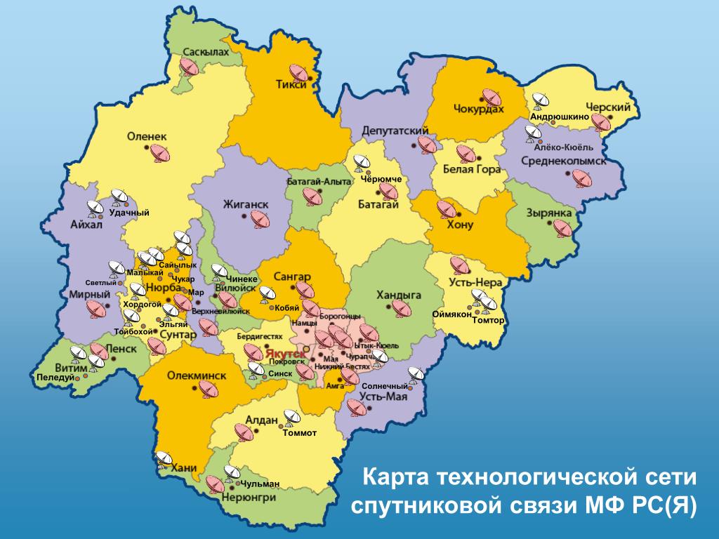 Карта технологической сети спутниковой связи МФ РС(Я) Андрюшкино Алёко-Кюёль Чёрюмче Удачный Сайылык Малыкай Чукар Чинеке Светлый Мар Хордогой Кобяй Оймякон Томтор Эльгяй Тойбохой Синск Пеледуй Солнечный Томмот Чульман