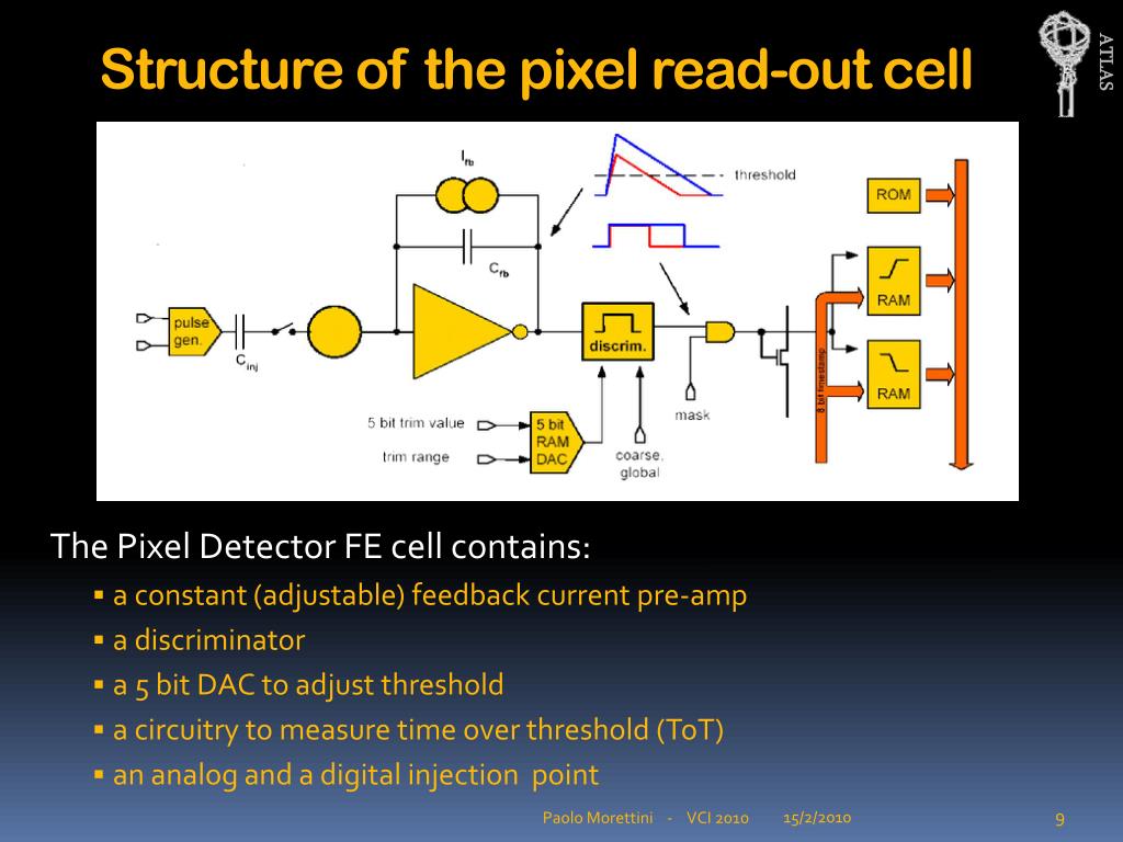 Structure of the pixel read-out cell • The Pixel Detector FE cell contains: • a constant (adjustable) feedback current pre-amp • a discriminator • a 5 bit DAC to adjust threshold • a circuitry to measure time over threshold (ToT) • an analog and a digital injection point Paolo Morettini - VCI 2010