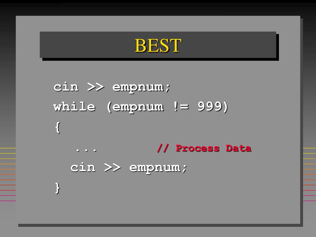 BEST cin >> empnum; while (empnum != 999) { ... // Process Data cin >> empnum; }