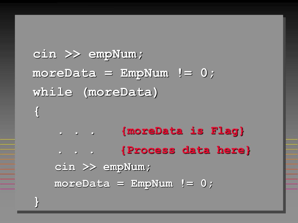 cin >> empNum; moreData = EmpNum != 0; while (moreData) { . . . {moreData is Flag} . . . {Process data here} cin >> empNum; moreData = EmpNum != 0; }