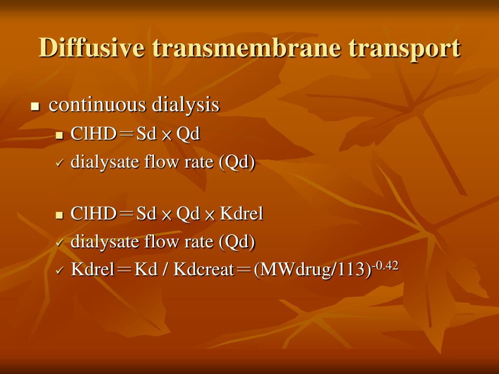 Diffusive transmembrane transport • continuous dialysis • ClHD=Sd × Qd • dialysate flow rate (Qd) • ClHD=Sd × Qd × Kdrel • dialysate flow rate (Qd) • Kdrel=Kd / Kdcreat=(MWdrug/113)-0.42