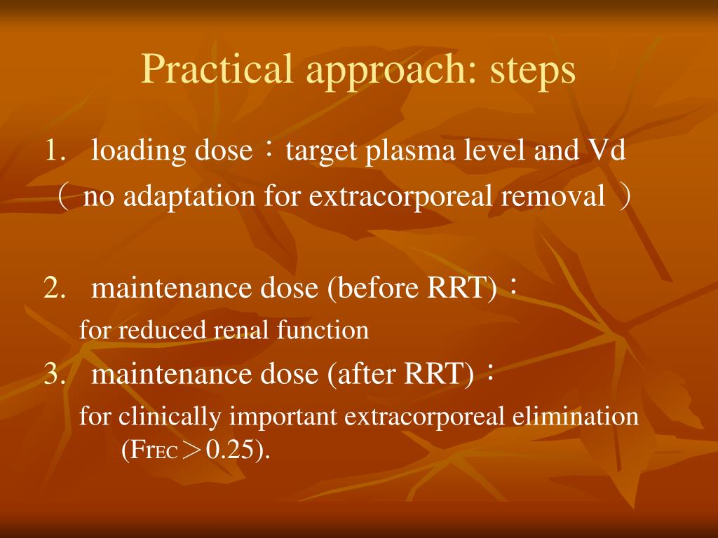 Practical approach: steps • loading dose:target plasma level and Vd ( no adaptation for extracorporeal removal ) • maintenance dose (before RRT): for reduced renal function • maintenance dose (after RRT): for clinically important extracorporeal elimination (FrEC>0.25).