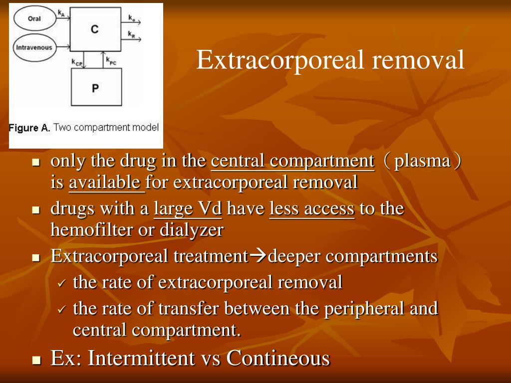 Extracorporeal removal • only the drug in the central compartment(plasma)is available for extracorporeal removal • drugs with a large Vd have less access to the hemofilter or dialyzer • Extracorporeal treatmentdeeper compartments • the rate of extracorporeal removal • the rate of transfer between the peripheral and central compartment. • Ex: Intermittent vs Contineous