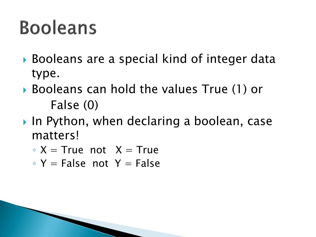 Booleans • Booleans are a special kind of integer data type. • Booleans can hold the values True (1) or False (0) • In Python, when declaring a boolean, case matters! • X = True not X = True • Y = False not Y = False