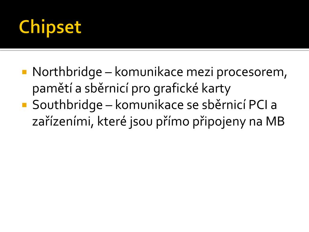 Chipset • Northbridge – komunikace mezi procesorem, pamětí a sběrnicí pro grafické karty • Southbridge – komunikace se sběrnicí PCI a zařízeními, které jsou přímo připojeny na MB