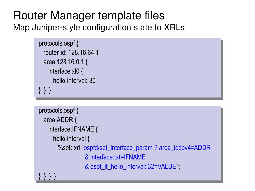 Router Manager template filesMap Juniper-style configuration state to XRLs protocols ospf { router-id: 128.16.64.1 area 128.16.0.1 { interface xl0 { hello-interval: 30 } } } protocols.ospf { area.ADDR { interface.IFNAME { hello-interval { %set: xrl "ospfd/set_interface_param ? area_id:ipv4=ADDR & interface:txt=IFNAME & ospf_if_hello_interval:i32=VALUE"; } } } }