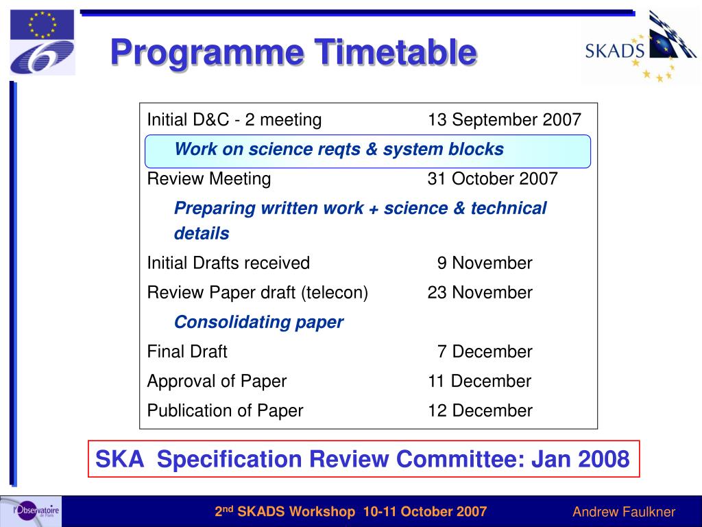 Programme Timetable Initial D&C - 2 meeting 13 September 2007 Work on science reqts & system blocks Review Meeting 31 October 2007 Preparing written work + science & technical details Initial Drafts received 9 November Review Paper draft (telecon) 23 November Consolidating paper Final Draft 7 December Approval of Paper 11 December Publication of Paper 12 December SKA Specification Review Committee: Jan 2008