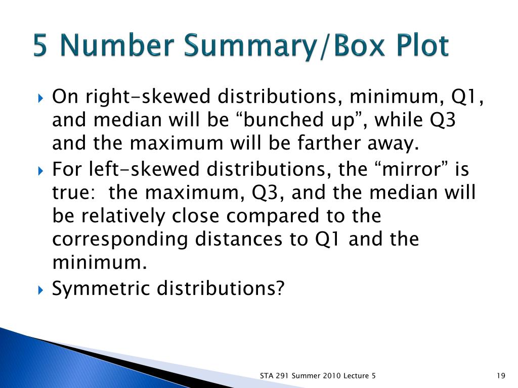 5 Number Summary/Box Plot • On right-skewed distributions, minimum, Q1, and median will be “bunched up”, while Q3 and the maximum will be farther away. • For left-skewed distributions, the “mirror” is true: the maximum, Q3, and the median will be relatively close compared to the corresponding distances to Q1 and the minimum. • Symmetric distributions? STA 291 Summer 2010 Lecture 5