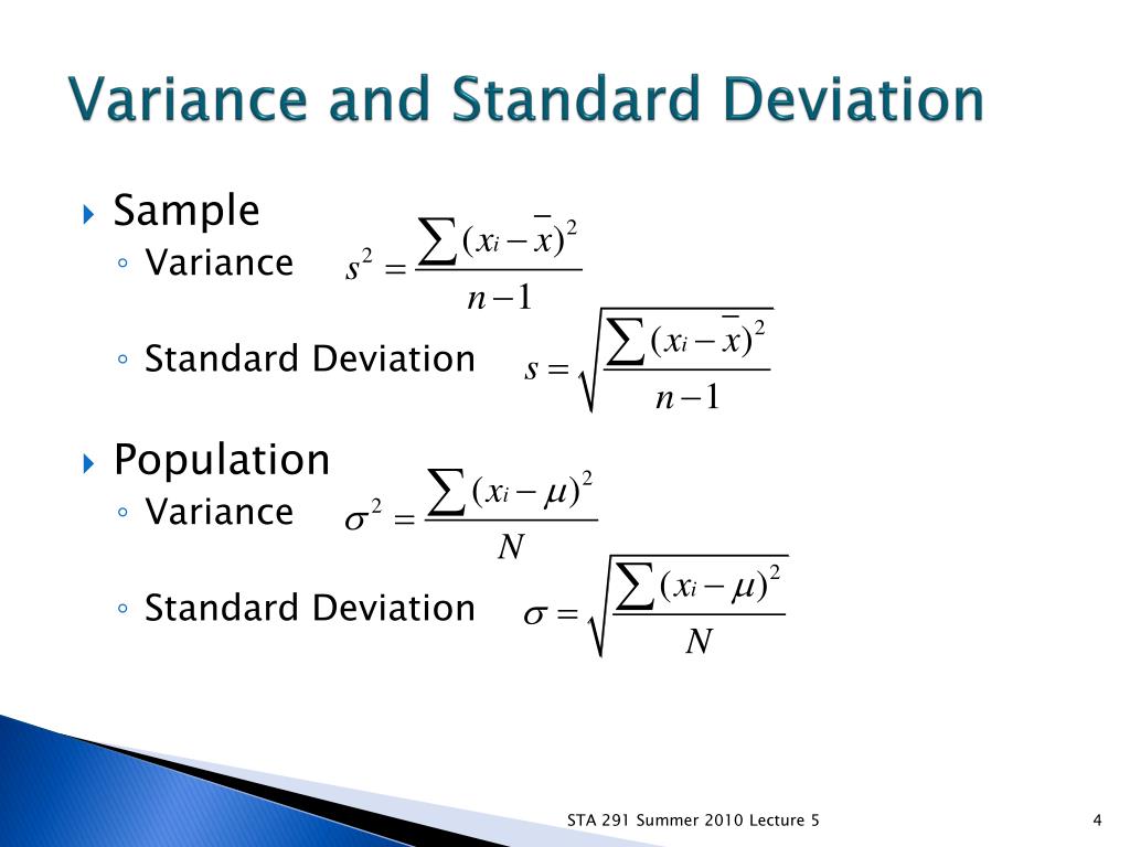 Variance and Standard Deviation • Sample • Variance • Standard Deviation • Population • Variance • Standard Deviation STA 291 Summer 2010 Lecture 5