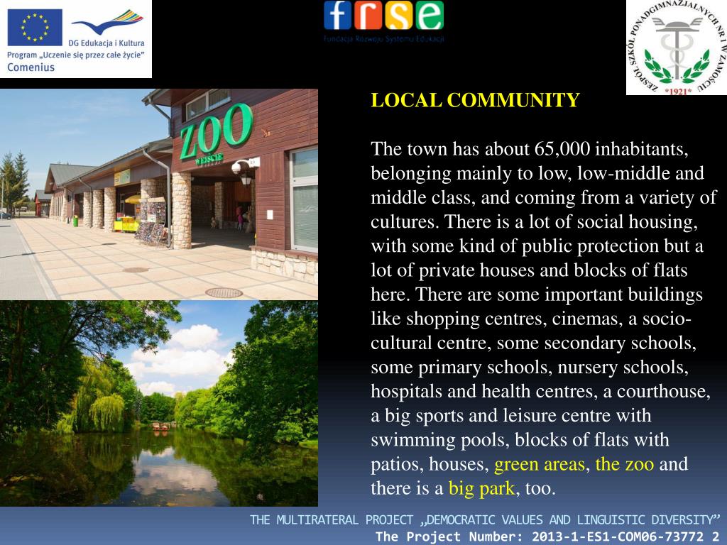 THE MULTIRATERAL PROJECT „DEMOCRATIC VALUES AND LINGUISTIC DIVERSITY”The Project Number: 2013-1-ES1-COM06-73772 2 LOCAL COMMUNITY The town has about 65,000 inhabitants, belonging mainly to low, low-middle and middle class, and coming from a variety of cultures. There is a lot of social housing, with some kind of public protection but a lot of private houses and blocks of flats here. There are some important buildings like shopping centres, cinemas, a socio-cultural centre, some secondary schools, some primary schools, nursery schools, hospitals and health centres, a courthouse, a big sports and leisure centre with swimming pools, blocks of flats with patios, houses, green areas, the zoo and there is a big park, too.