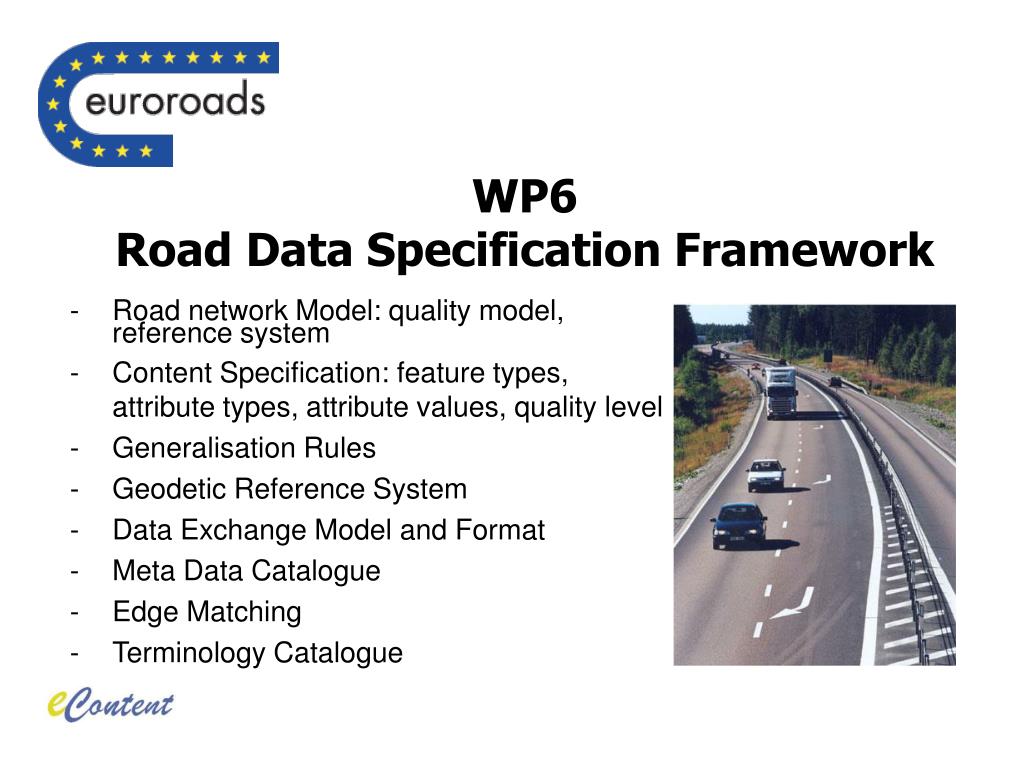 WP6Road Data Specification Framework - Road network Model: quality model, reference system Content Specification: feature types, attribute types, attribute values, quality level Generalisation Rules Geodetic Reference System Data Exchange Model and Format Meta Data Catalogue Edge Matching Terminology Catalogue