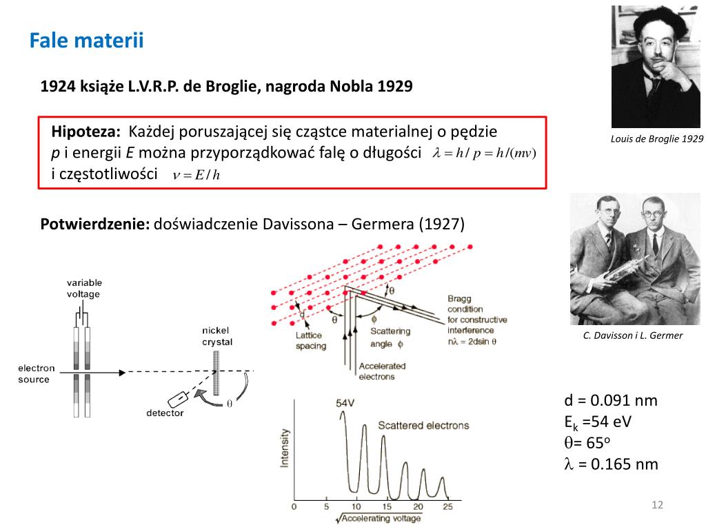 Fale materii 1924 książe L.V.R.P. de Broglie, nagroda Nobla 1929 Hipoteza: Każdej poruszającej się cząstce materialnej o pędzie p i energii E można przyporządkować falę o długości i częstotliwości Louis de Broglie 1929 Potwierdzenie: doświadczenie Davissona – Germera (1927) C. Davisson i L. Germer • d = 0.091nm • Ek =54 eV • = 65o • l = 0.165 nm