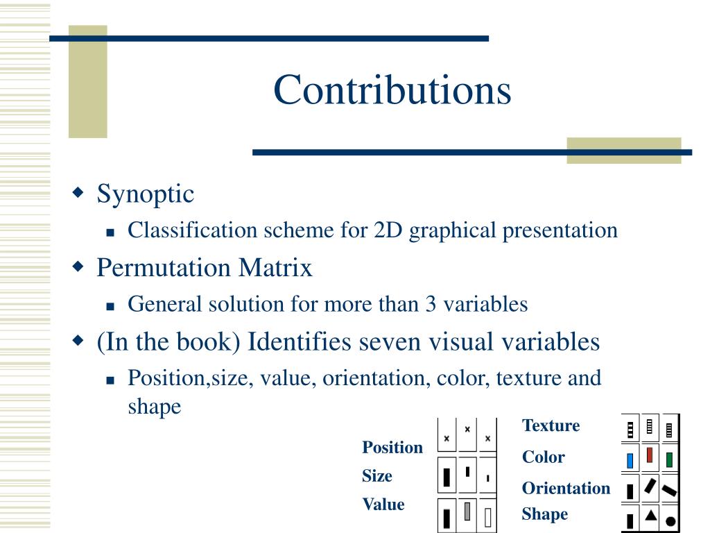 Contributions • Synoptic • Classification scheme for 2D graphical presentation • Permutation Matrix • General solution for more than 3 variables • (In the book) Identifies seven visual variables • Position,size, value, orientation, color, texture and shape
