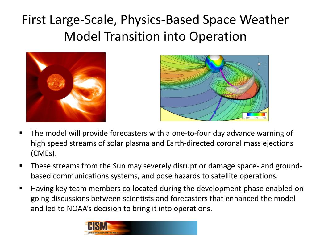 First Large-Scale, Physics-Based Space Weather Model Transition into Operation • The model will provide forecasters with a one-to-four day advance warning of high speed streams of solar plasma and Earth-directed coronal mass ejections (CMEs). • These streams from the Sun may severely disrupt or damage space- and ground-based communications systems, and pose hazards to satellite operations. • Having key team members co-located during the development phase enabled on going discussions between scientists and forecasters that enhanced the model and led to NOAA’s decision to bring it into operations.