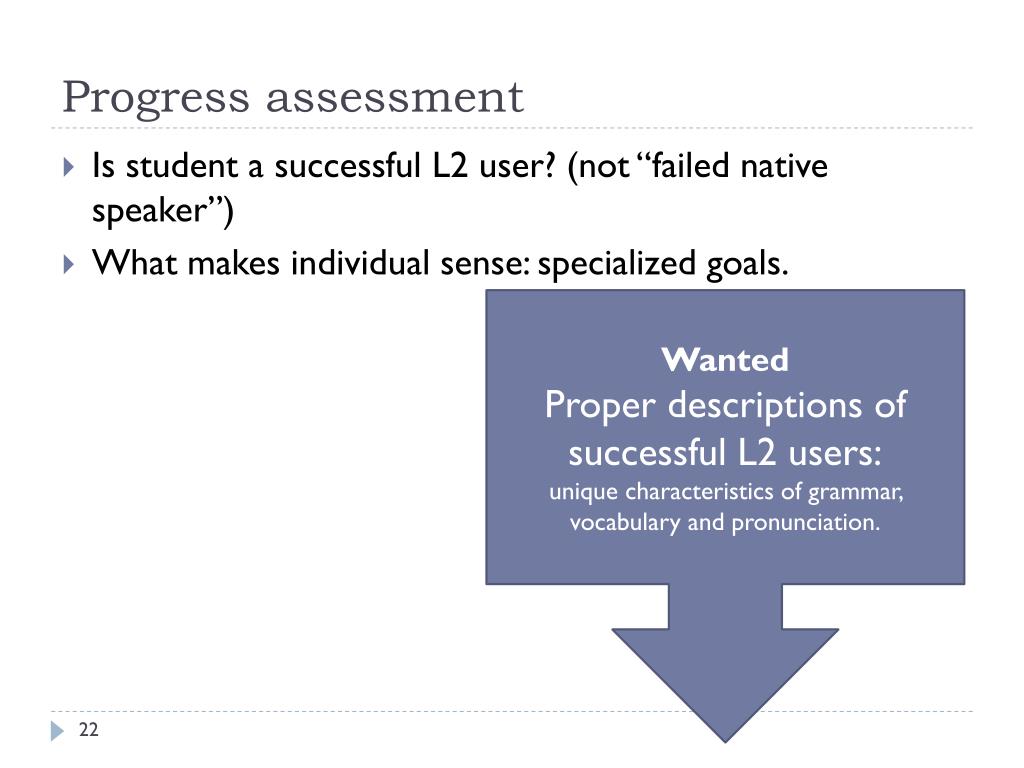 Progress assessment • Is student a successful L2 user? (not “failed native speaker”) • What makes individual sense: specialized goals. Wanted Proper descriptions of successful L2 users: unique characteristics of grammar, vocabulary and pronunciation.