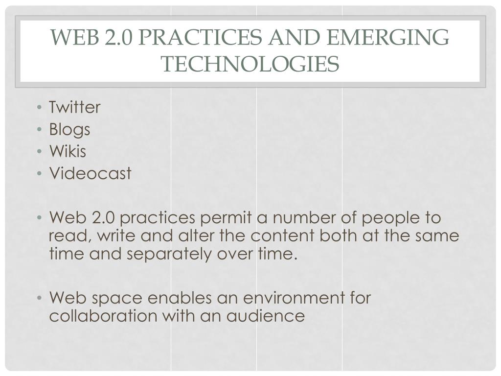 Web 2.0 practices and Emerging Technologies • Twitter • Blogs • Wikis • Videocast • Web 2.0 practices permit a number of people to read, write and alter the content both at the same time and separately over time. • Web space enables an environment for collaboration with an audience