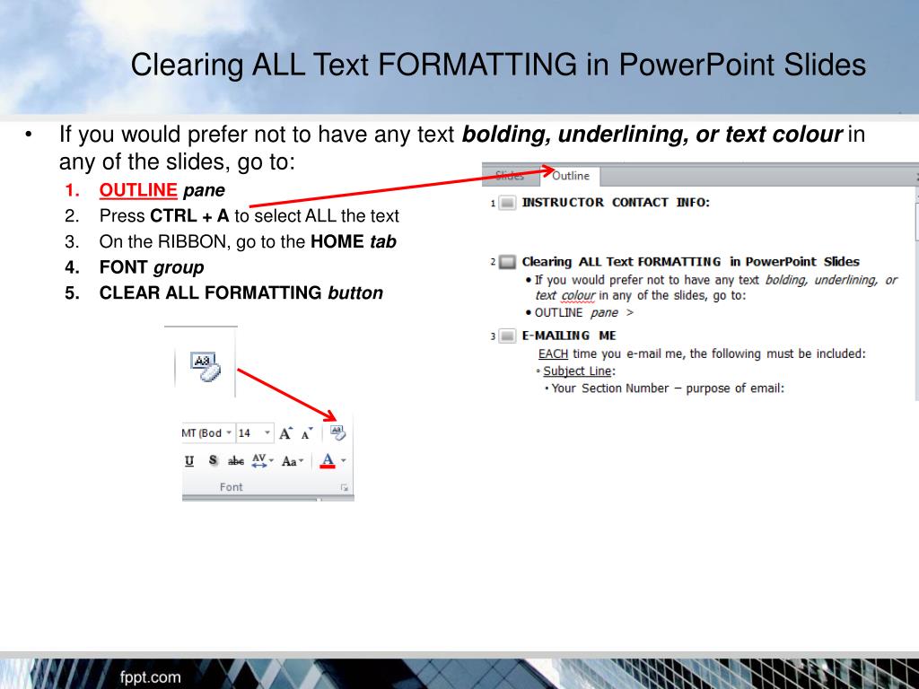 Clearing ALL Text FORMATTING in PowerPoint Slides • If you would prefer not to have any text bolding, underlining, or text colour in any of the slides, go to: • OUTLINEpane • Press CTRL + A to select ALL the text • On the RIBBON, go to the HOMEtab • FONT group • CLEAR ALL FORMATTING button