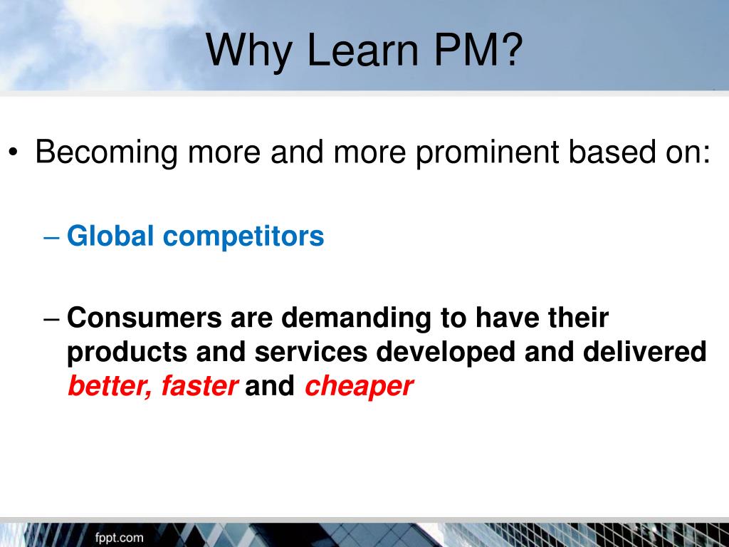 Why Learn PM? • Becoming more and more prominent based on: • Global competitors • Consumers are demanding to have their products and services developed and delivered better,fasterand cheaper