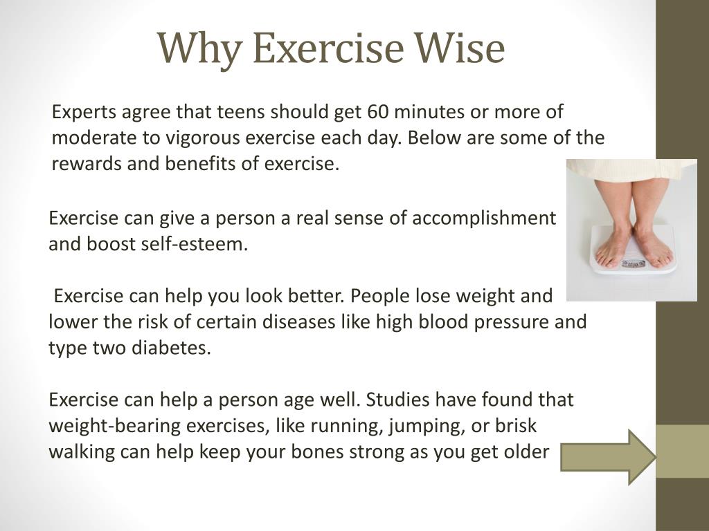 Why Exercise Wise Experts agree that teens should get 60 minutes or more of moderate to vigorous exercise each day. Below are some of the rewards and benefits of exercise. Exercise can give a person a real sense of accomplishment and boost self-esteem. Exercise can help you look better. People lose weight and lower the risk of certain diseases like high blood pressure and type two diabetes. Exercise can help a person age well. Studies have found that weight-bearing exercises, like running, jumping, or brisk walking can help keep your bones strong as you get older