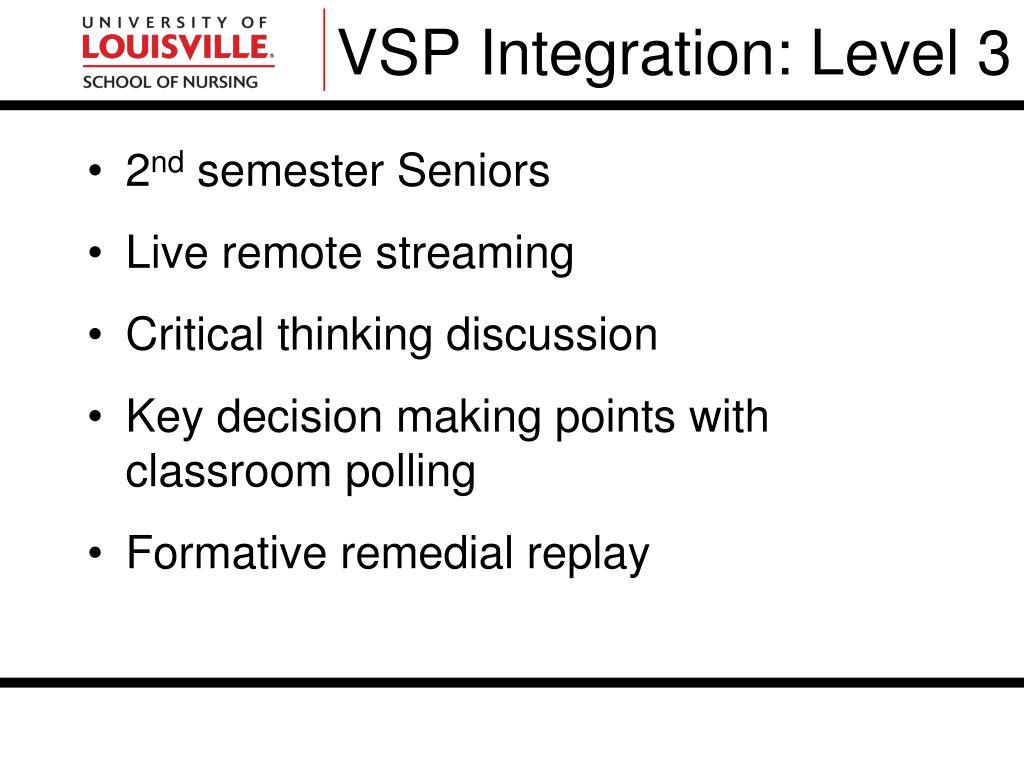 VSP Integration: Level 3 • 2nd semester Seniors • Live remote streaming • Critical thinking discussion • Key decision making points with classroom polling • Formative remedial replay