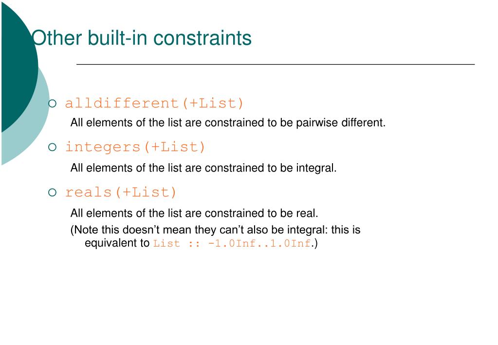 Other built-in constraints • alldifferent(+List) • All elements of the list are constrained to be pairwise different. • integers(+List) • All elements of the list are constrained to be integral. • reals(+List) • All elements of the list are constrained to be real. • (Note this doesn’t mean they can’t also be integral: this is equivalent to List :: -1.0Inf..1.0Inf.)
