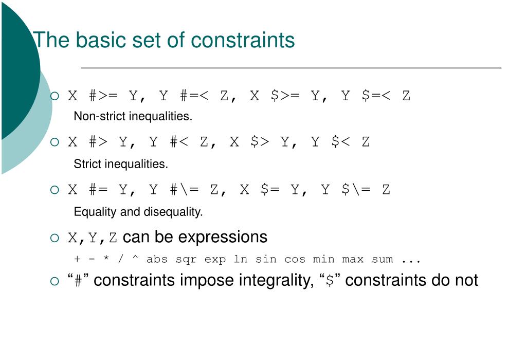 The basic set of constraints • X #>= Y, Y #=< Z, X $>= Y, Y $=< Z • Non-strict inequalities. • X #> Y, Y #< Z, X $> Y, Y $< Z • Strict inequalities. • X #= Y, Y #\= Z, X $= Y, Y $\= Z • Equality and disequality. • X,Y,Z can be expressions • + - * / ^ abs sqr exp ln sin cos min max sum ... • “#” constraints impose integrality, “$” constraints do not
