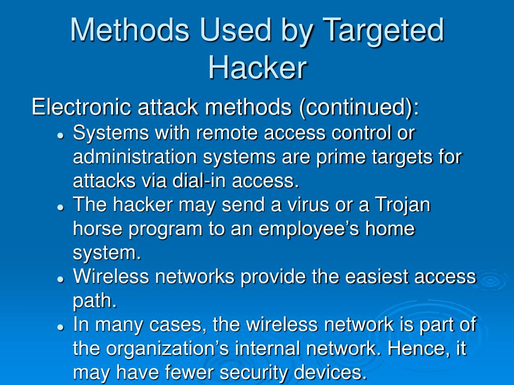 Methods Used by Targeted Hacker Electronic attack methods (continued): • Systems with remote access control or administration systems are prime targets for attacks via dial-in access. • The hacker may send a virus or a Trojan horse program to an employee’s home system. • Wireless networks provide the easiest access path. • In many cases, the wireless network is part of the organization’s internal network. Hence, it may have fewer security devices.