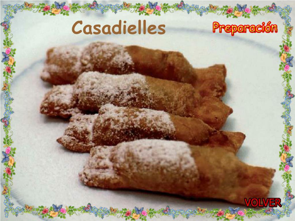 Preparación Ingredientes 1/2 kilo de nueces 100 gramos de mantequilla Harina 1 vasito de vino blanco 1/2 vasito de leche 1/2 vaso de agua Levadurina Vinagre o limón Azúcar Anís Sal Aceite para freír Se parten las nueces y se muelen. Se mide taza y media de nuez molida y se le añade media de azúcar y una copa de anís corriente; si se desea, se le puede poner también algo de vino blanco o coñac, o un poco de mantequilla y miel en lugar de azúcar, pues así se preparaban en tiempos pasados. Se prepara la pasta, mezclando en una fuente la manteca de aldea —mantequilla— partida en trozos, el aceite, agua y vino blanco, una cucharadita de sal y un chorrito de limón o vinagre; se mezcla todo bien y se va añadiendo harina mezclada con una cucharadita de levadurina hasta formar una pasta que no se pegue a las manos. Esta pasta, como el hojaldre, se trabajará lo imprescindible, pues de lo contrario se quedaría correosa. Se extiende la masa con la ayuda del rollo enharinado, dos o tres veces, y después se le da un reposo, en sitio fresco o nevera, durante una hora más. Pasado el tiempo, se cortan trozos de esta pasta, se extienden hasta dejarla bien fina, y se van rellenando, formando casadielles, cerrando bien los bordes para que no salga el relleno de nuez. Seguidamente se van friendo en aceite abundante, pero no muy caliente, para que la pasta se fría bien y no quede cruda por dentro. Ya doradas, se van colocando en un papel de estraza para que absorba el exceso de aceite que puedan tener; seguidamente, se rebozan con azúcar pasándolas a una fuente. Se sirven templadas o frías. Se conservan bien dos o tres días.